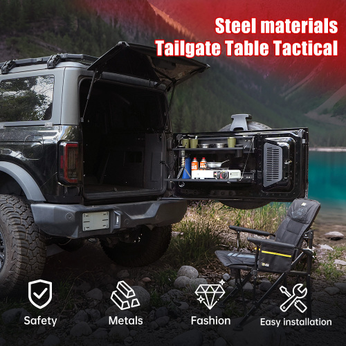 1. Adventure-Ready Storage & OrganizationNo more digging for gear! The rugged MOLLE panel lets you strap on tool kits, first-aid supplies, or camp essentials—keeping everything secure and instantly accessible. Free up cargo space and conquer the trails with military-grade efficiency. 2. Your Mobile Command CenterCamp. Cook. Repair. Repeat. Fold it down for a rock-solid workstation: prep meals tailgate-style, rig fishing gear, or tackle trailside fixes. Crafted from aircraft-grade aluminum (or powder-coated steel), it laughs off bumps, spills, and off-road chaos. 3. Disappears When You Don’t Need ItZero space wasted. This ultra-slim table stows flush against your tailgate, locking securely to eliminate rattles. No bulk, no hassle—just extra room for adventure gear. 4. Bolt-On in 5 Minutes—No Drilling!Factory holes. Zero mods. Unlike cheap universal tables, ours bolts directly into OEM mounting points. Unbox → install → hit the dirt. Guaranteed fit or your money back. 5. Made for Your 2021–2024 Ford Bronco should’ve built it. Precision-engineered for 2-Door & 4-Door Broncos, this isn’t just an add-on—it’s a factory-clean upgrade for overlanders, campers, and weekend warriors.