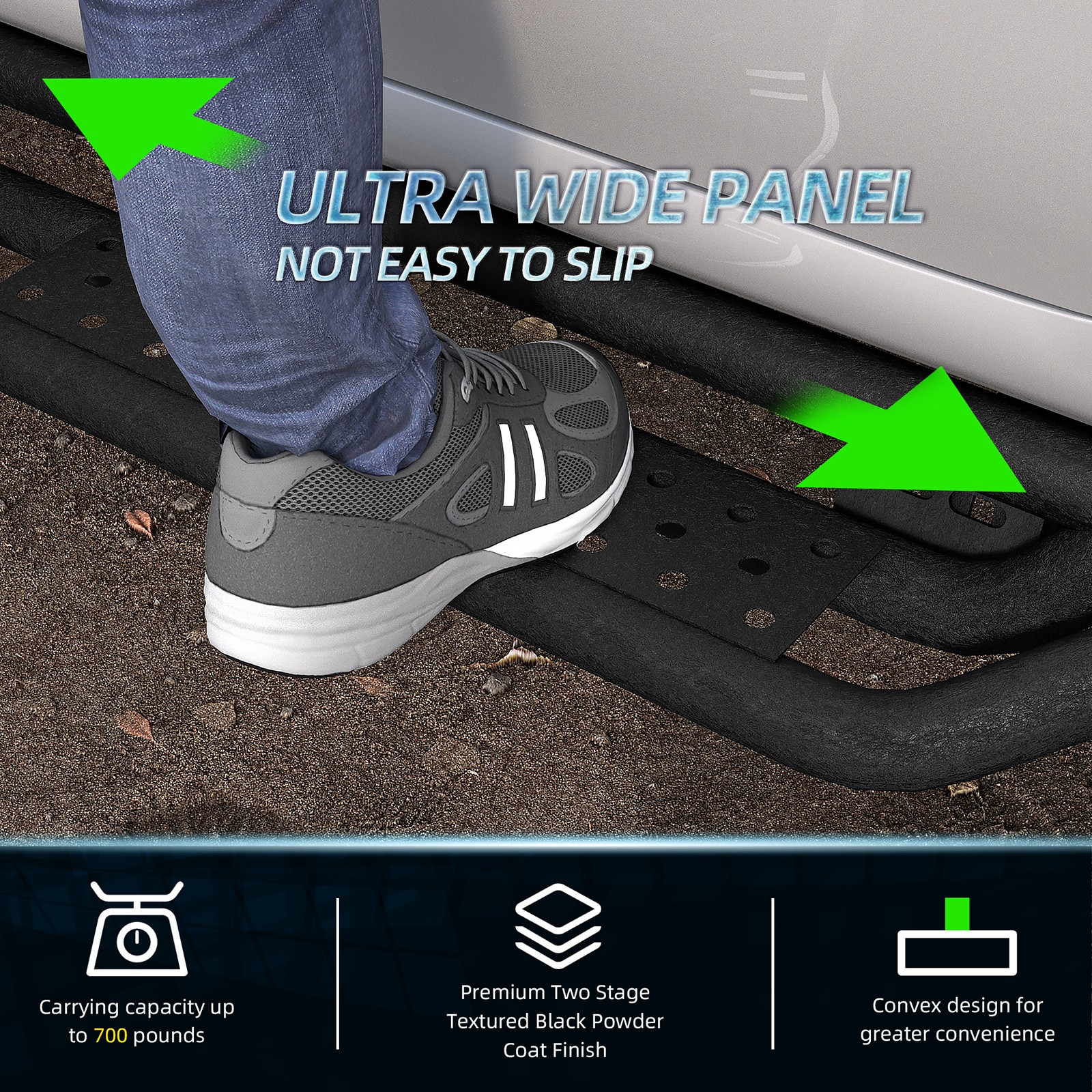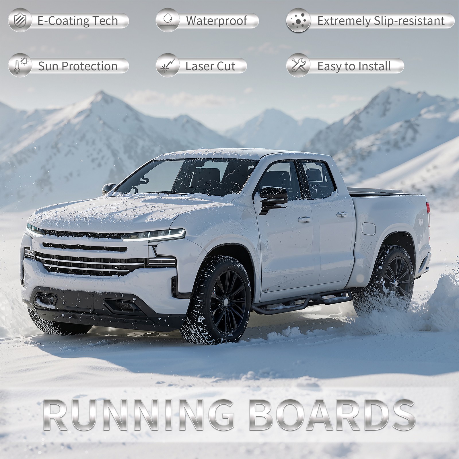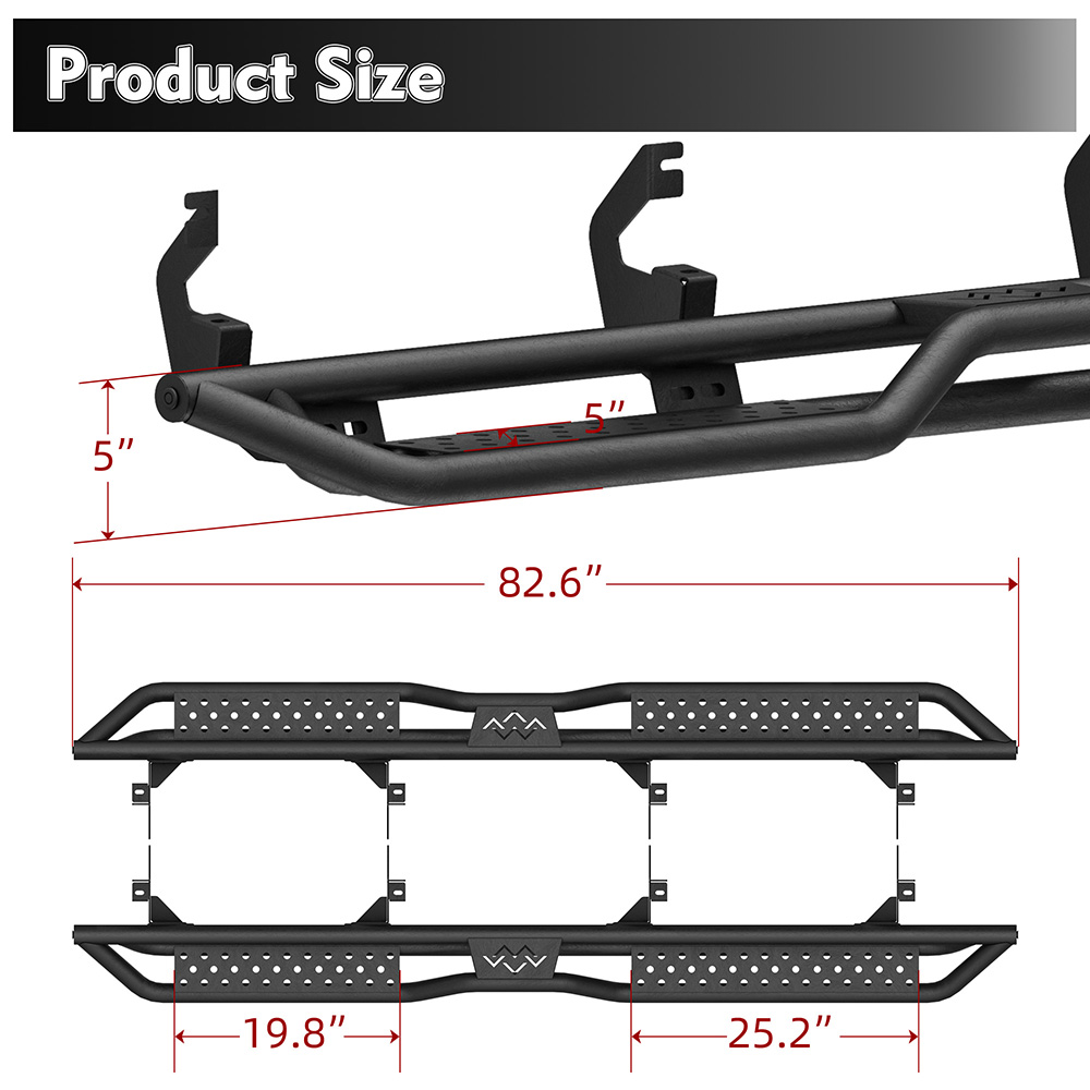 尊敬的买家和朋友们,请注意: 1. 本产品全新未使用,未开封,无损坏,并附带原包装。 2. [完美贴合] - 定制的一体式设计确保牢固贴合。 3. [产品特点] 坚固耐用,独特的粉末涂层表面具有出色的防锈和防腐蚀性能,让您在任何条件下都能安心驾驶。激光切割踏板表面防滑,抓地力强,可承受高达 700 磅的重量而不弯曲。 侧裙采用两级踏板设计,为配备升高套件和超大轮胎的车辆提供更便捷的上下车体验;三管设计为车辆底部和侧面提供更全面的保护,并防止被侧裙板或悬挂障碍物钩住。 4. [螺栓安装] 焊接支架提供额外的强度,包装内含 2 根加强杆、一套支架和五金件。附带DIY安装说明书,无需切割或钻孔,20分钟即可完成安装。 4.【无忧服务及注意事项】支架未预先焊接在踏板上!请放心购买!下单前,请务必查看产品主图,确认驾驶室尺寸。 5. 如果您不确定您的车辆是否与我们的产品兼容,或者您的产品存在任何问题(缺陷、损坏),请通过消息联系我们。我们将协助您解决任何问题,并在收到您的消息后确认回复! 6. 为了您的安全,我们建议您联系专业人员进行安装。 适用于 2019-2025 款雪佛兰 Silverado/GMC Sierra 1500 Crew Cab 的侧踏板/防撞杆 产品信息: 材质:碳钢 颜色:黑色 类型:踏板 外观处理:粉末涂层 重量限制:700磅 汽车适配类型:车辆专用适配 物品重量:71磅 商品尺寸(长 x 宽 x 高):84.20 x 11.80 x 8.7 英寸 产品尺寸:84.20 x 11.80 x 8.7 英寸 车辆服务类型:适用于 2019-2025 款雪佛兰 Silverado/GMC Sierra 1500 Crew Cab; 适用于 2020-2025 款 Silverado/Sierra 2500HD 和 3500HD 件数:2 件 车辆位置:左侧、右侧 产品包装: 2 个侧踏板(驾驶员侧和乘客侧) 1 x DIY安装手册 1 x 所有配件套装 适用范围: 适用于 2019-2025 款雪佛兰 Silverado/GMC Sierra 1500 Crew Cab 适用于 2020-2025 款 Silverado/Sierra 2500HD 和 3500HD 请在下单前查看商品图片,图片显示了驾驶室尺寸。 (购买前请仔细核对。)