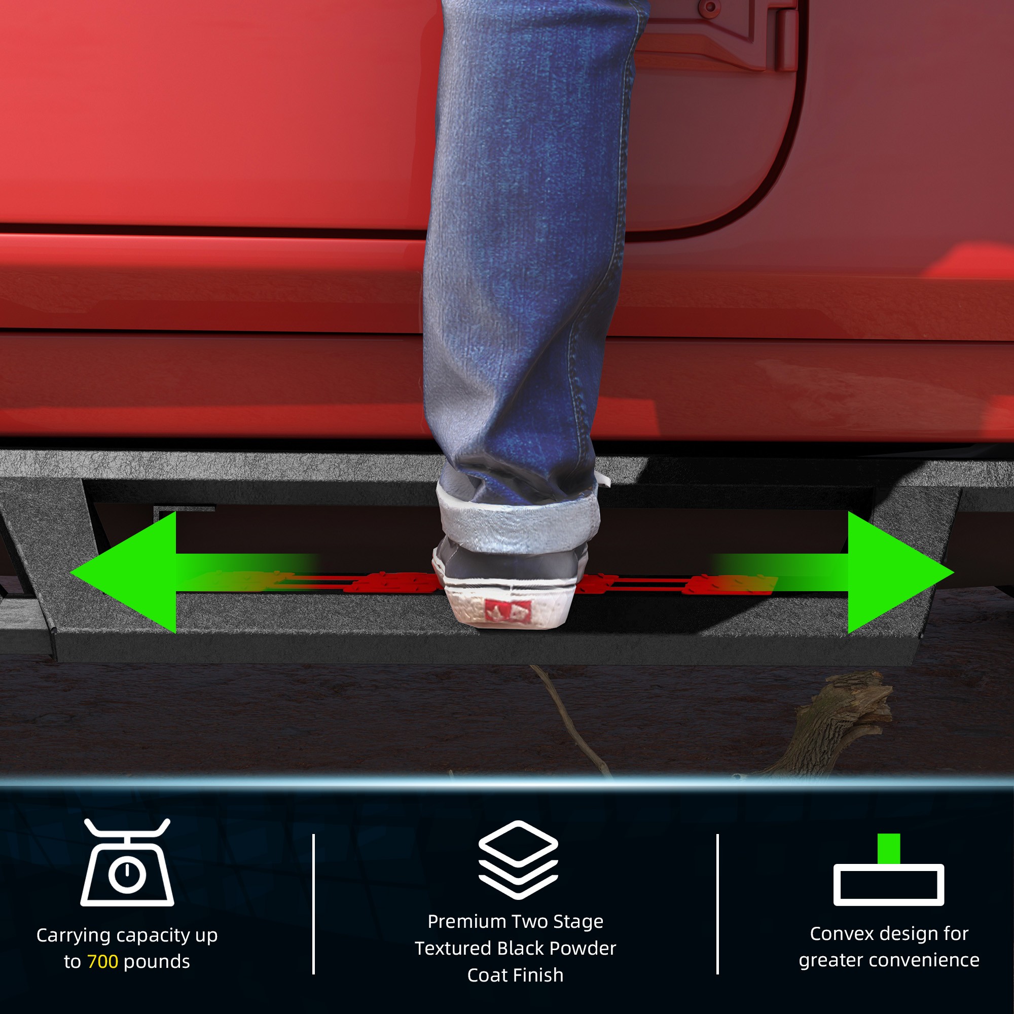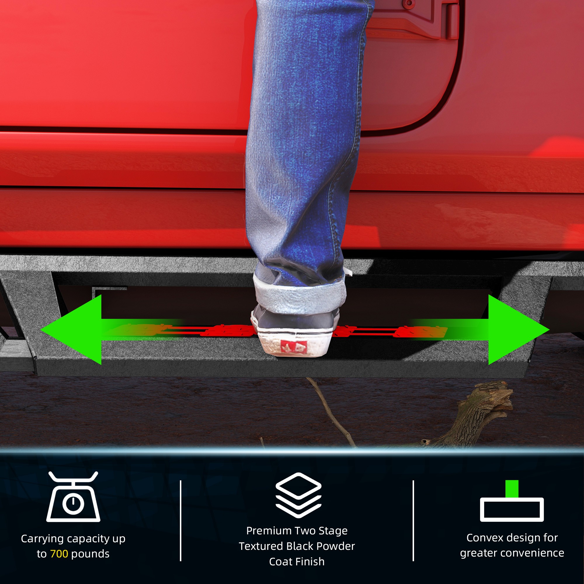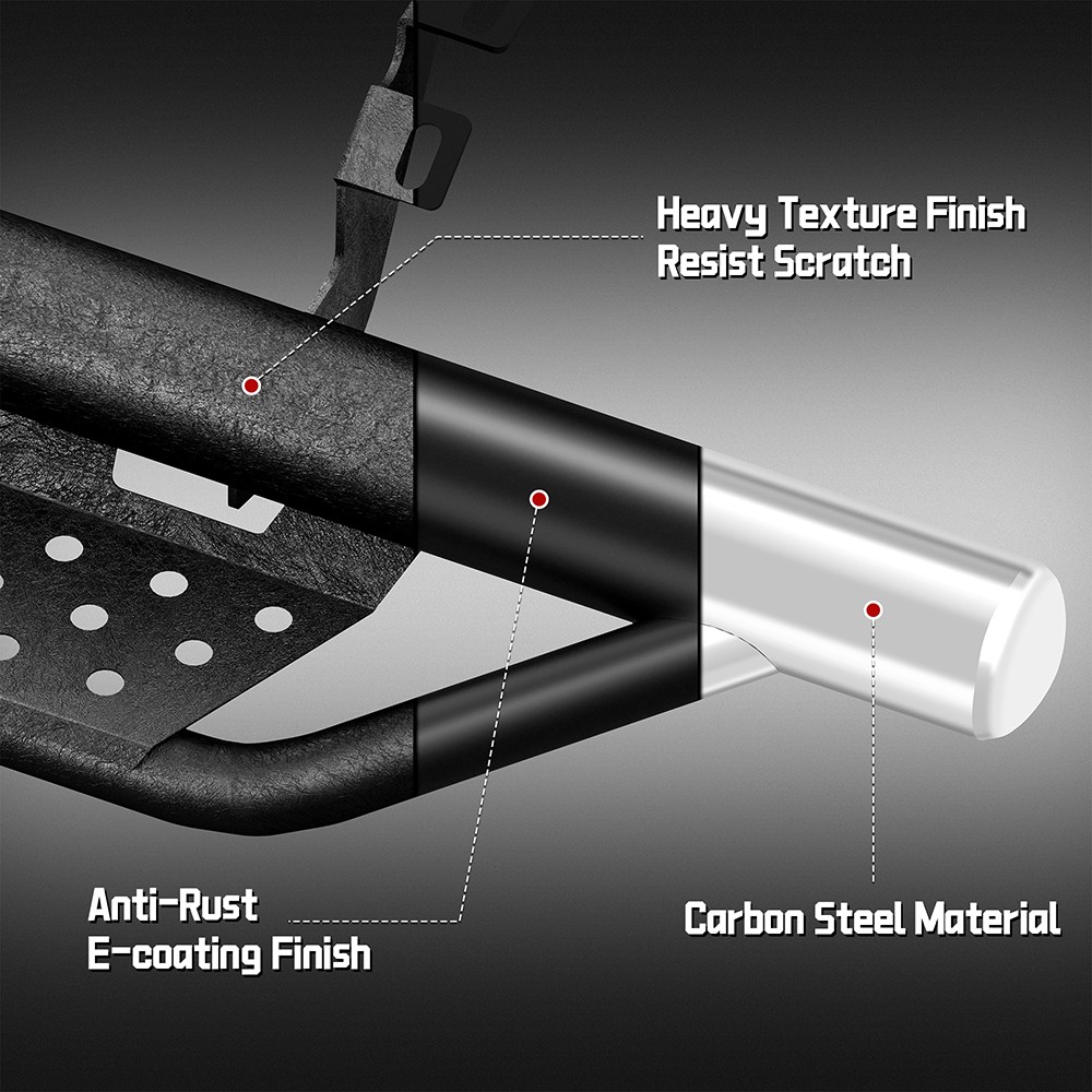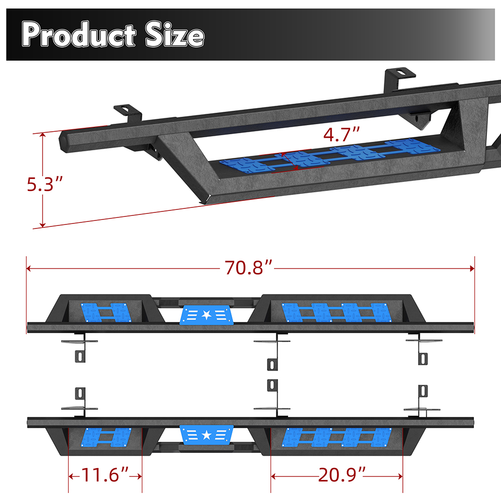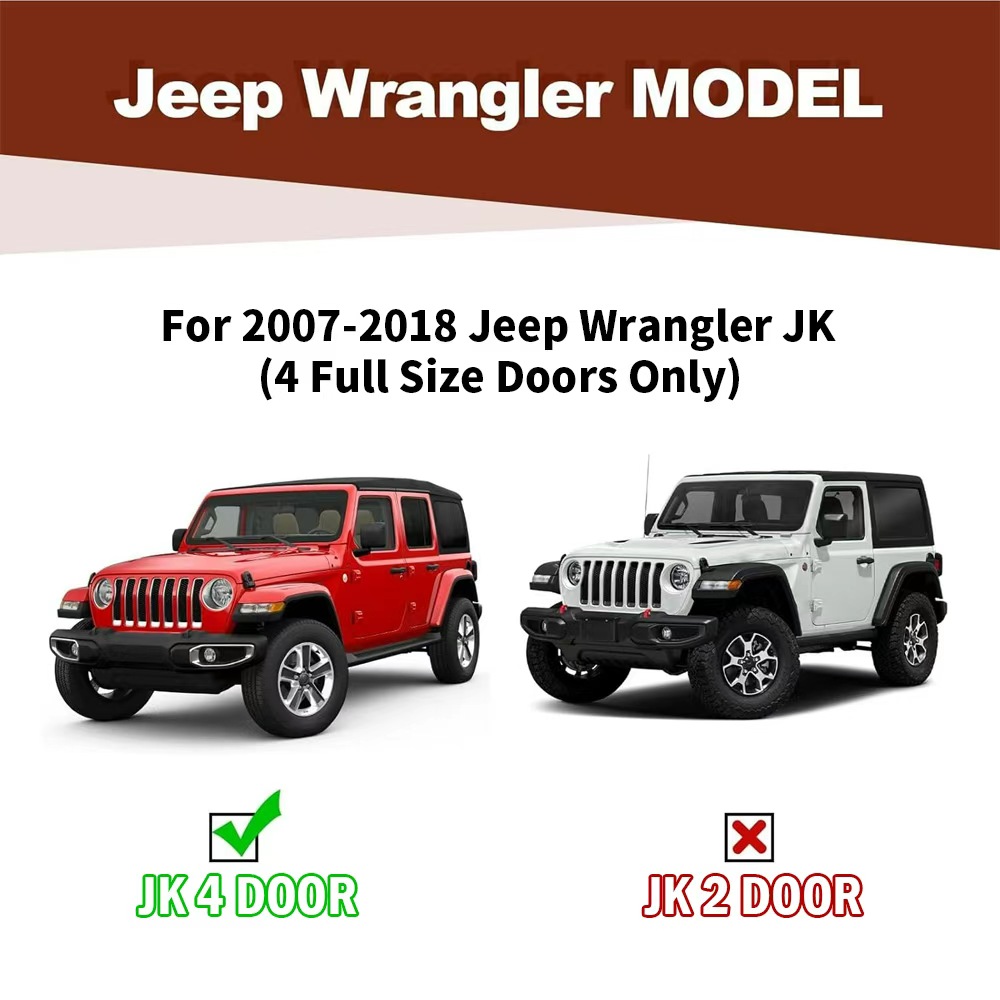 温馨提示:购买此产品时,除了红色踏板贴片外,我们还会赠送您一个蓝色贴片。 产品信息: 颜色:黑色/红色/蓝色 材质:重型碳钢 外表面处理:粉末涂层 物品重量:52.70磅 包装尺寸:72.80 x 12 x 7 英寸 汽车适配类型:车辆专用适配 商品型号:Wrangler JL踏板 车辆服务类型:适用于 2007-2018 款 Jeep Wrangler Jk Unlimited 4 门车型。 车辆位置:左侧、右侧 产品包装: 2 个侧踏板(驾驶员侧和乘客侧) 1 x DIY安装手册 1 x 所有配件套装 双色布贴(红色和蓝色) 适用范围: 适用于 2007-2018 款 Jeep Wrangler JK Unlimited 四门车型。 (不适用于 2018 款 Jeep Wrangler JL)。 请在下单前查看商品图片,图片显示了驾驶室尺寸。 (购买前请仔细核对。) 适用车型: 适用于 2007-2018 款 Jeep Wrangler JK Unlimited 四门车型。 (不适用于 2018 款 Jeep Wrangler JL)。 请在订购前查看产品图片中的驾驶室尺寸。 (请在购买前仔细核对。) 尊敬的买家和朋友们,请注意: 1. 产品全新、未使用、未开封、无损坏,并附带原包装。 2. [完美贴合] - 定制的一体式设计确保牢固贴合。 3. [产品特点] 坚固耐用,独特的粉末涂层工艺提供卓越的防锈和防腐蚀性能,让您在任何条件下都能安心驾驶。激光切割踏板表面防滑,抓地力强,可承受高达 700 磅的重量而不弯曲。 侧门槛采用两级踏板设计,为配备升高套件和超大轮胎的车辆提供更便捷的上下车体验。三管式设计为车辆底部和侧面提供更佳的保护,并防止被侧裙板或悬挂障碍物钩住。 4.【螺栓安装】焊接支架提供额外强度,包装内含 2 根加强杆、一套支架和五金件;附带 DIY 安装说明书,无需切割或钻孔,20 分钟即可完成安装。 5.【无忧服务及注意事项】支架未预先焊接在踏板上!请放心购买!订购前请务必查看产品图片中的驾驶室尺寸。 7. 如果您不确定您的车辆是否与我们的产品兼容,或者您的产品存在任何问题(缺陷、损坏),请通过消息联系我们。我们将协助您解决任何问题,并在收到您的回复后予以确认!