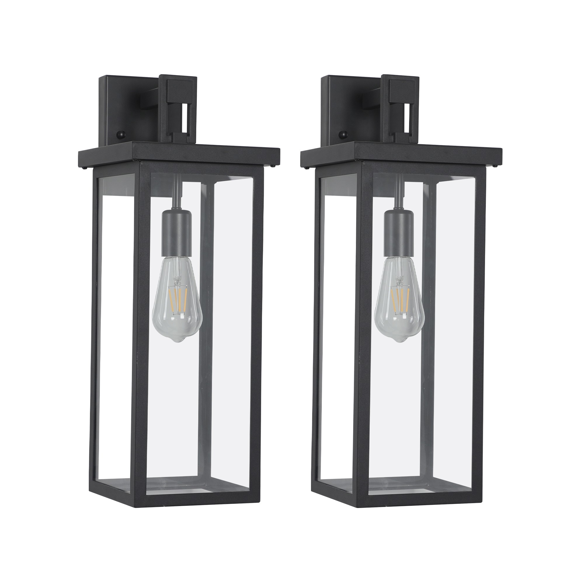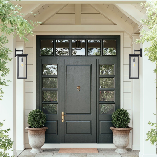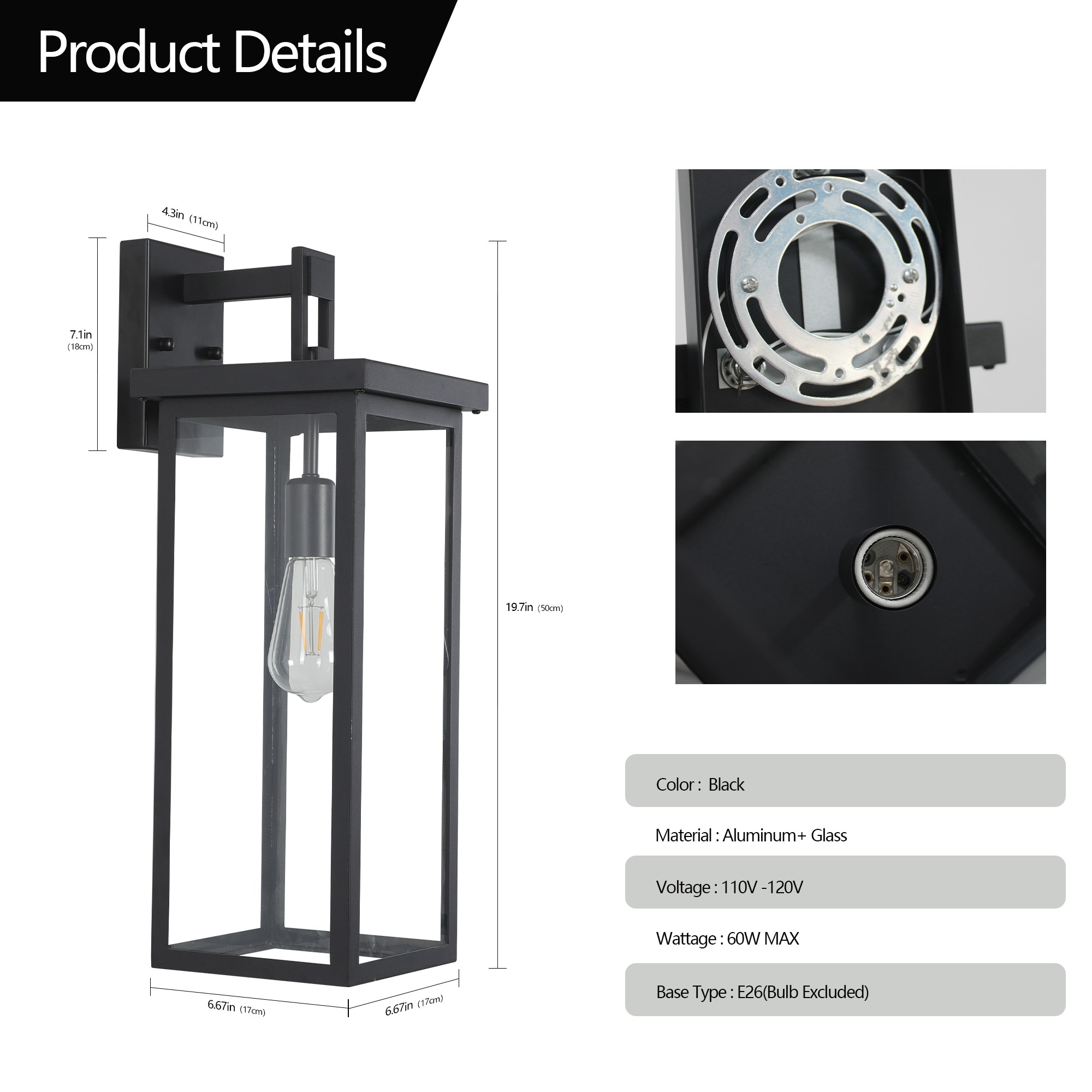 现代简约设计:这些户外壁灯采用经典方形设计,配以黑色金属框架和透明玻璃材质,适用于多种家居风格,并能为您的户外空间增添一份现代气息。 防锈材质:灯具采用高品质防锈材料制成,可在各种天气条件下长期使用,确保耐用性和长久美观。 兼容多种灯泡:灯具可与标准的E26灯座兼容,并能够与多种类型的灯泡(如LED、CFL、白炽灯等)相容,以满足不同的照明需求。 安装简便:配备所有安装所需硬件,用户无需复杂工具即可轻松完成安装。