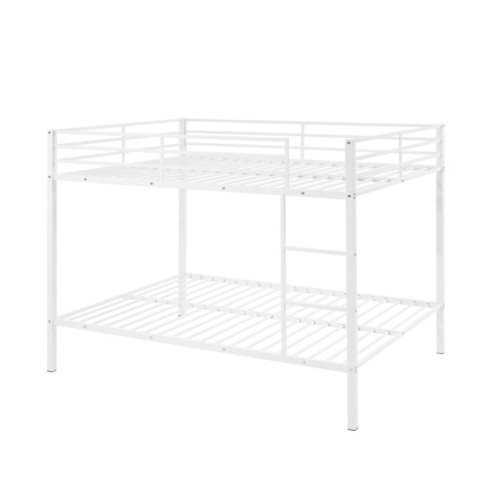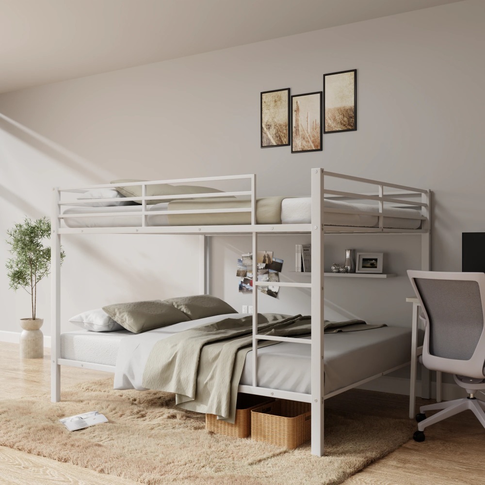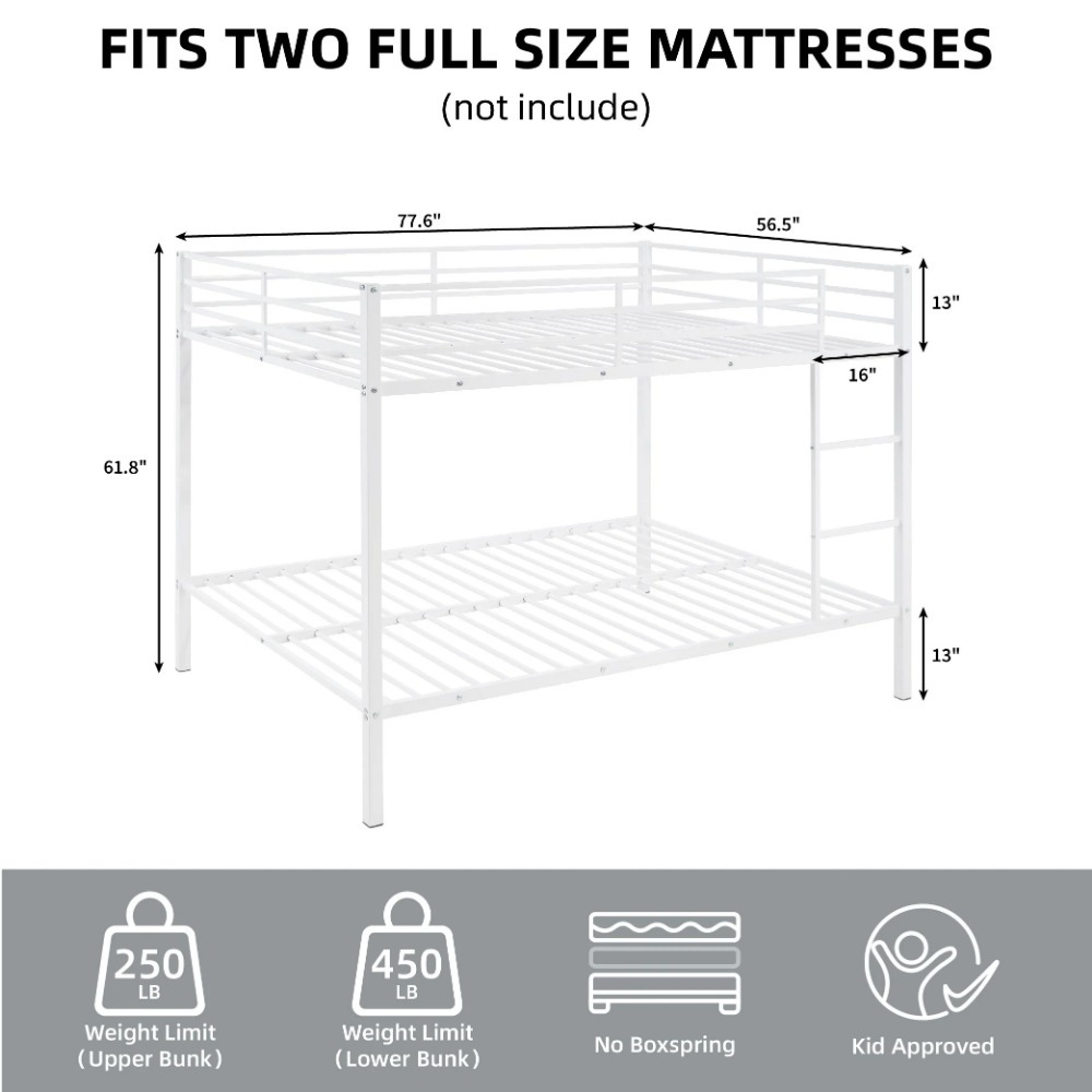 全尺寸全铺式床铺,重型金属双层床架,内置梯子和安全护栏,适合儿童的小型金属双层床架,无需弹簧床垫,适用于小空间,白色