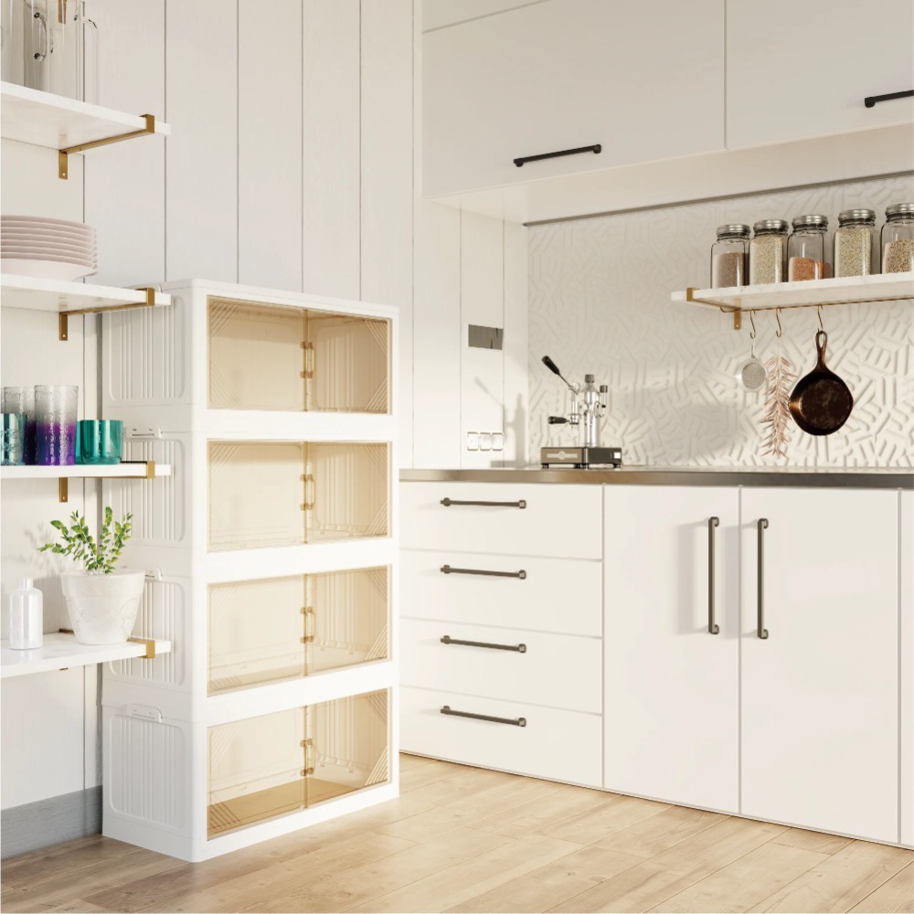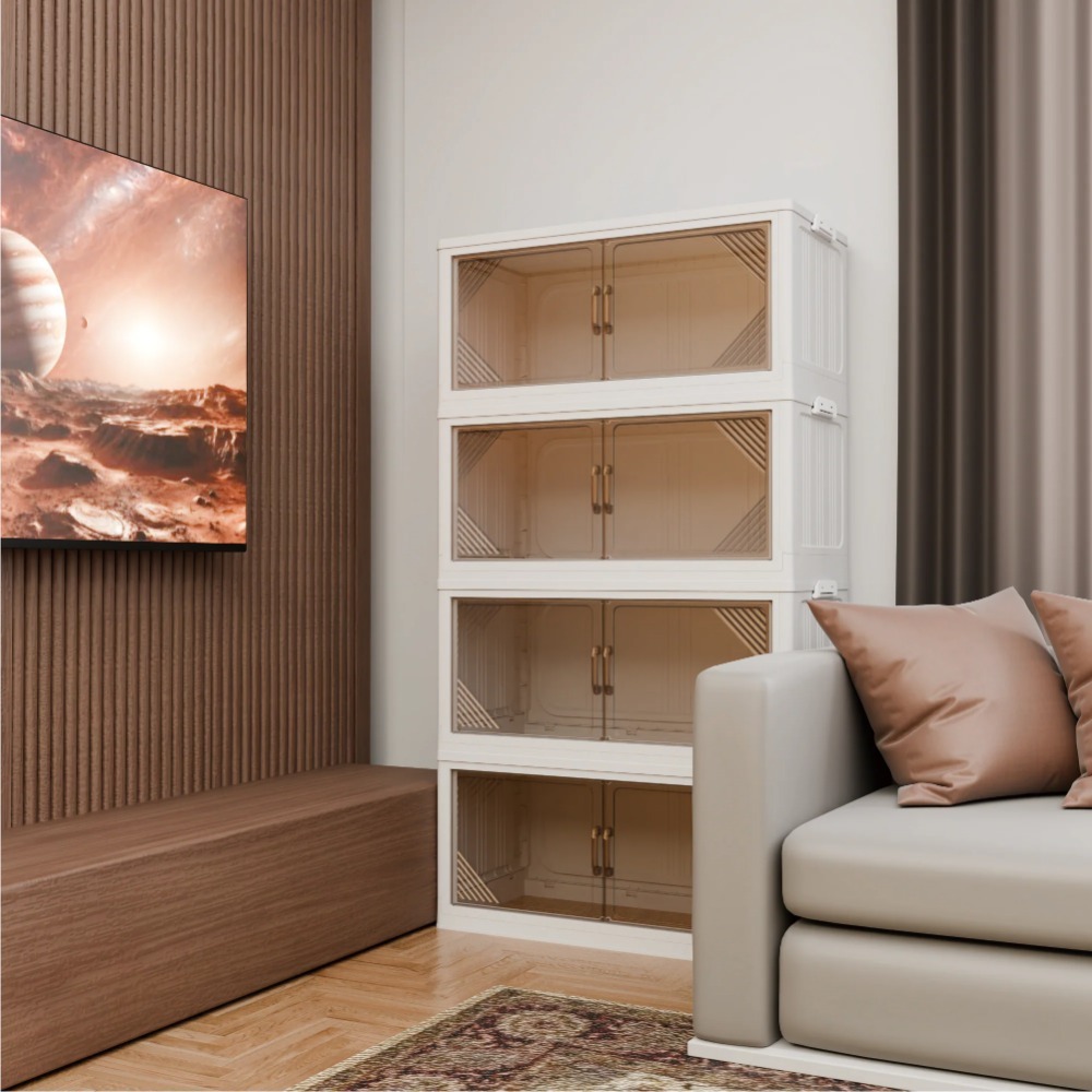 573QT 4-Pack 35.4’’ Wide Transparent Plastic Storage Cabinets for Closet Organizers and Storage, Folding Storage Box, Stackable Storage Bins with Open Front Door