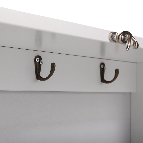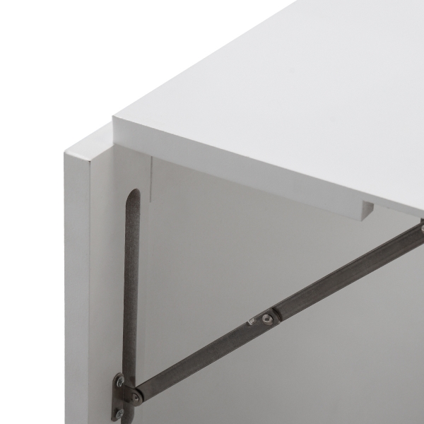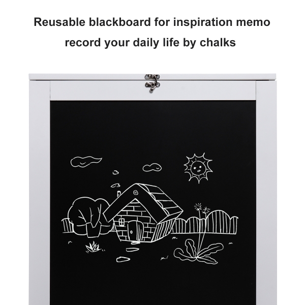 挂壁折叠桌-黑白 材质:P2密度板+NC漆 颜色:黑色+白色 折叠尺寸:60(L)*15.5(W)*75(H)cm 展开尺寸:149.5(L)*87(W)*60.5(H)cm 桌面尺寸:71.5*56.5*1.5cm 黑板尺寸:51*64.8cm 基本构造: 折叠时正面是一块黑板,正上方的银白色牛角扣起固定作用的; 展开后从上到下可以分为三部分:储物架,桌面,带黑板桌脚。 其他细节: 储物架内配三个古铜色金属挂钩; 桌面与储物架用合页连接,桌脚与桌面用铰链连接; 产品含一份全英文说明书。 Features: 【Sturdy structure】Made of high-quality P2 grade MDF material and pained in NC, this wall mounted desk is sturdy and durable enough for your daily use; 【Intimate design】The storage shelf has ample space and 3 metal hooks for storing keys, books, cups and so on. The desk-foot blackboard is perfect to record personal to-dos or leave messages; 【Space saving】The wall-mounted and foldable design greatly saves floorspace, used as a computer table or study desk when expanded and a cabinet when folded to keep the room spacious and tidy; 【Modern style】This modern folding table has simple lines and classic colors, suitable for decorating the bedroom, living room, reading room, office or other places you want; 【Easy to assemble and clean】All necessary accessories and easy-to-follow instructions are included, you can assemble it well and easy to clean with a damp cloth. Specifications: Color:white+black Material: P2 grade MDF+NC paint Foldedsize: 23.6*6.1*29.5 inches Expand size: 58.9*34.3*23.8 inches Net weight: 31 lbs