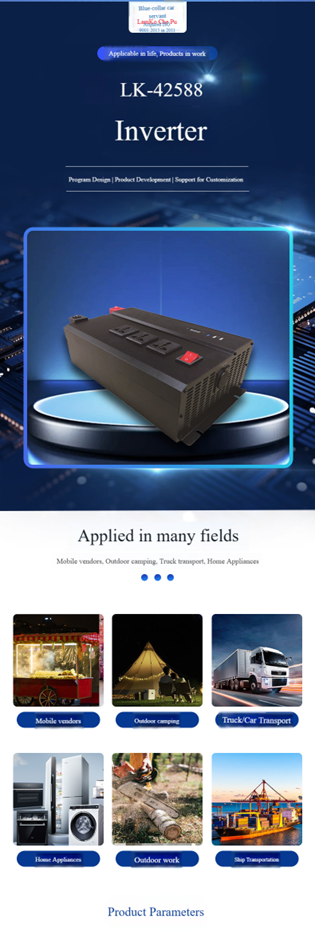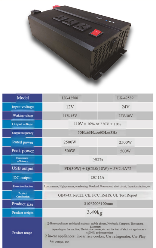 输出电压110V±10% or220V±10%,输出功率2500W,输出频率50±3HZ/60±3HZ,输入电压24V