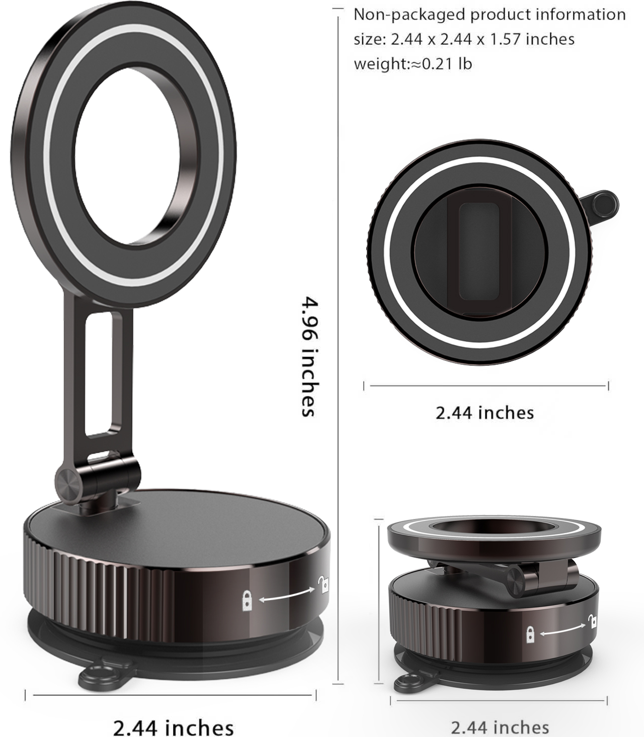 | 包装清单 | 1.吸盘式磁吸支架*1 2.引磁片*1 3.说明书*1 4.圆形垫片*1(滴胶款无此配件)5.清洁套装*1 |