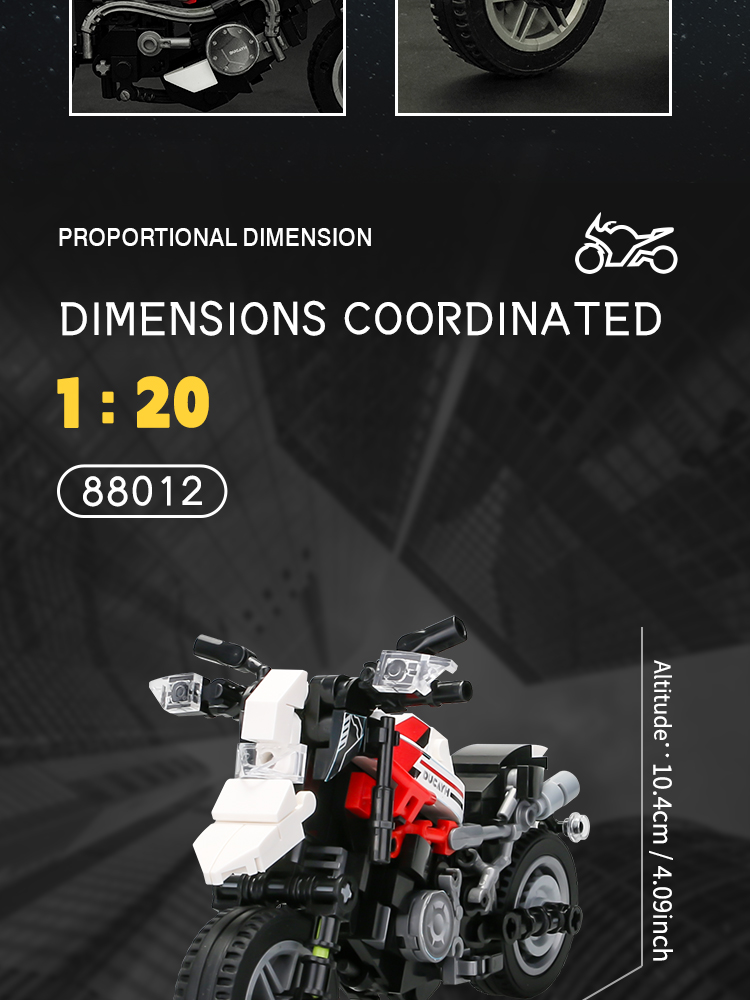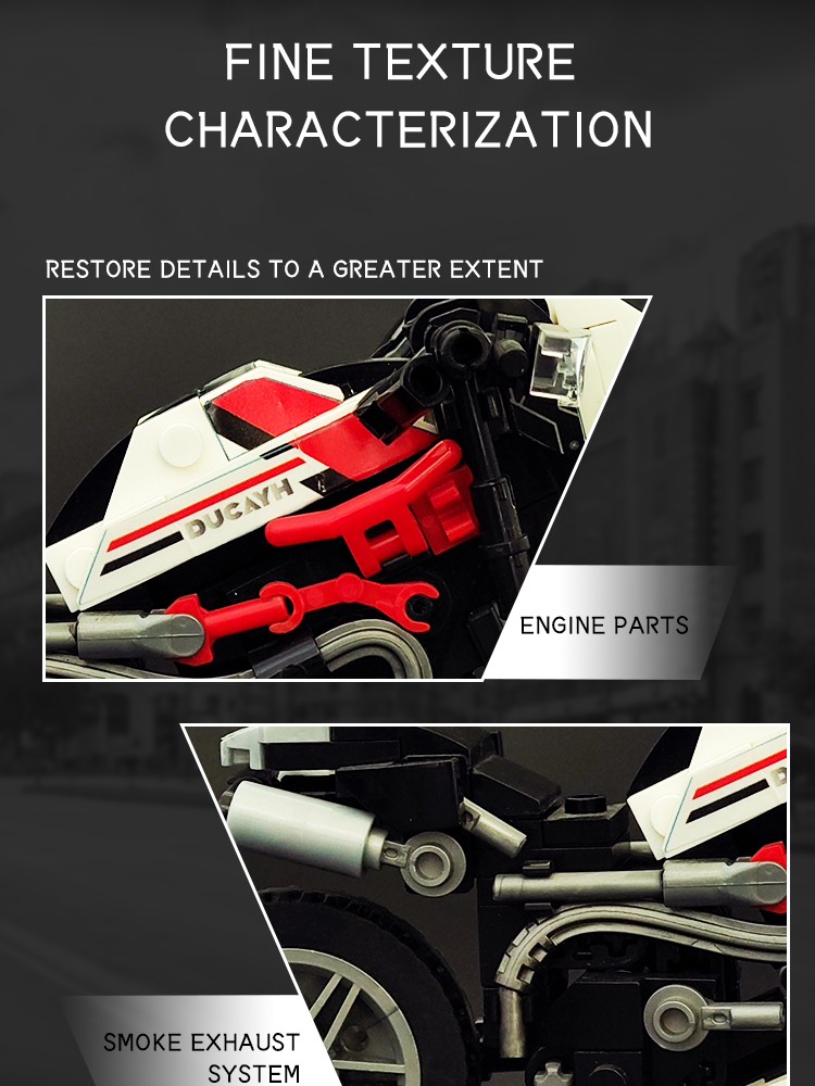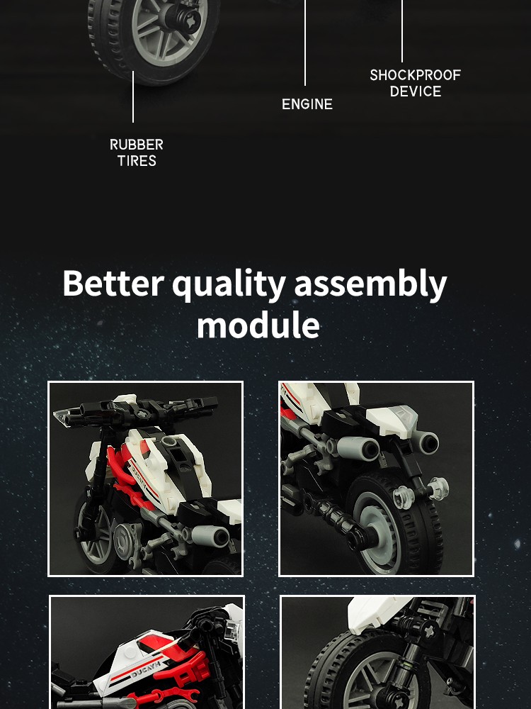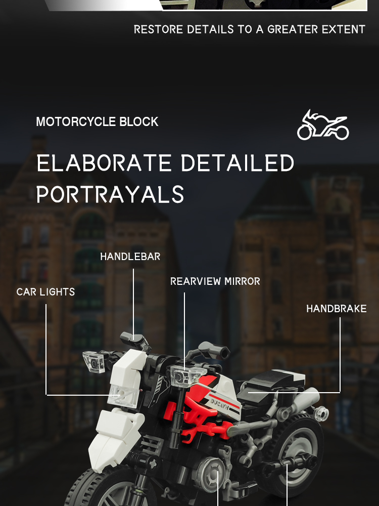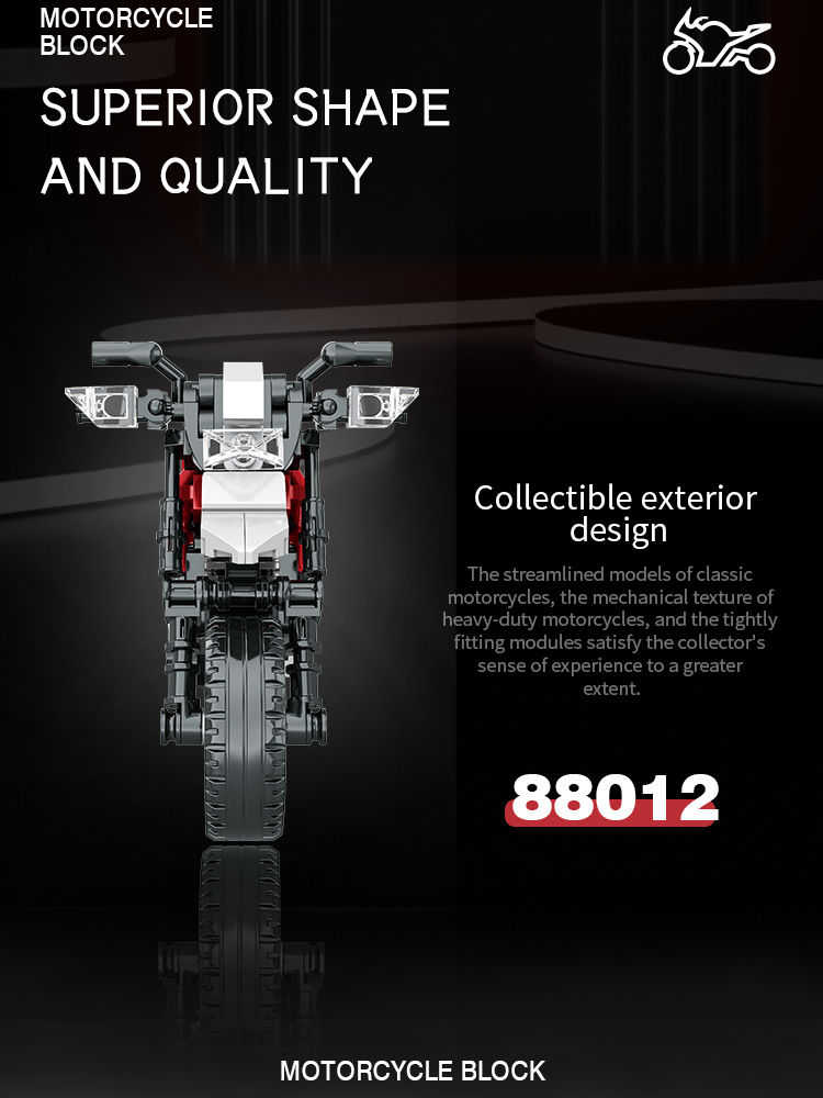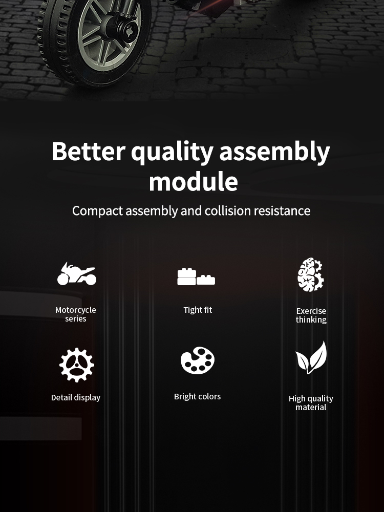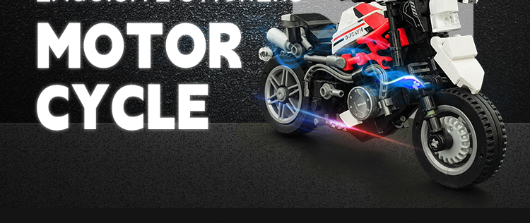 炫酷摩托车造型,精细复刻摩托车的流线型车身特征,车头、车轮等丰富细节,增强趣味性和可玩性,让玩家在动手组装的过程中,仿佛置身于机械世界的魅力之中。