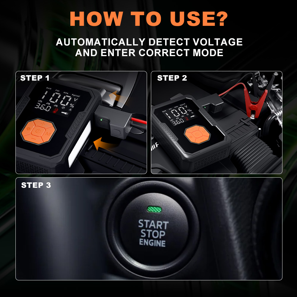产品名称:多功能启动电源&充气泵 型号:M120B-25G 外壳材质:ABS+防火 产品尺寸:179mm×127mm×55mm 单个包装尺寸:214x142x120mm, 屏幕显示:2.8英寸 输入:5V/3A 充电时间: 约3-5小时(QC3.0 18W) USB1输出:5V/3A 9V/2A 12V/1.5A USB2输出:5V2.4A 容量:分别有8000amh/12000amh/16000amh 启动电流:600A/900A/1200A 瞬间电流:1200A/1800A/2400A 气缸内径:25mm 充气范围:0-150PSI 充气时间:3-4分钟 (0-2.5BAR195轮胎) 额定功率:18W/ 充气90W